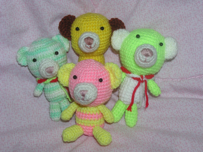 ตุ๊กตาถักหมีน้อย Posted on January 16, 2010 by admin เอาตุ๊กตาถักจากโครเชต์มาอวดโฉมหน่อยค่ะ หลังจากนอนอยู่ในถุงตั้งนาน น่ารักดีน้า:-) เค้ารักกันนะ รวมสี่สหาย ถ้ามีเวลาว่างว่าจะลองถักแบบอื่นดูบ้างแต่ช่วงนี้ขอเว้นวรรคซักพักก่อนนะคะ (เริ่มขี้เกียจอ่ะค่ะ)